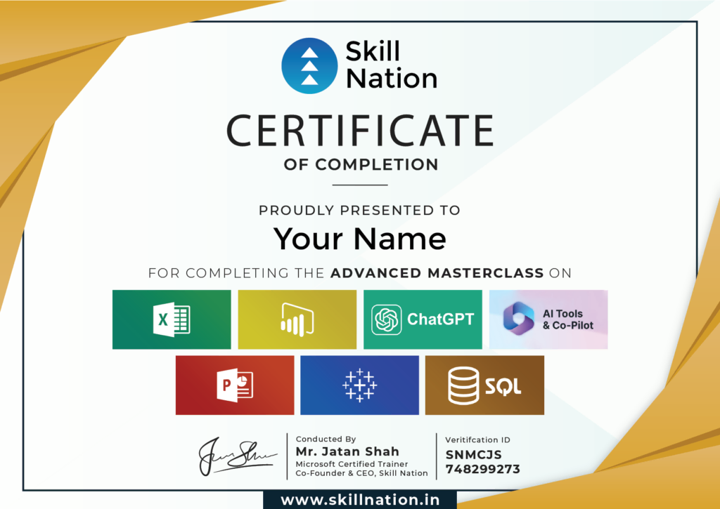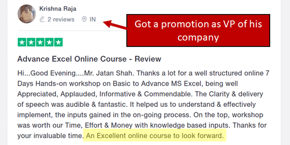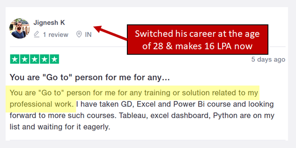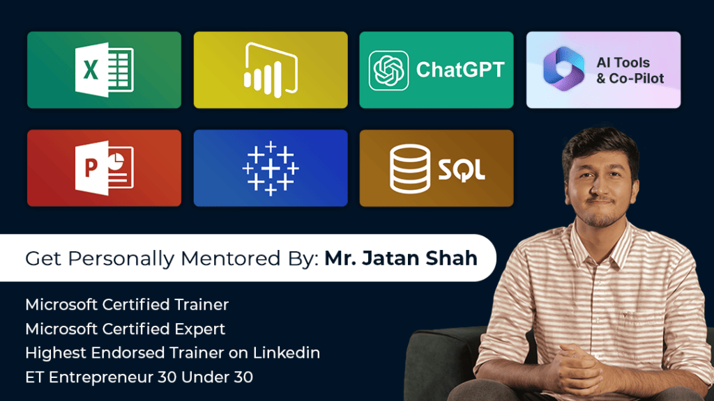 "Jatan's Masterclass has literally fastracked my career by 10 years. I can't believe I used to spend hours doing what I can do in minutes after enrolling & learning from Jatan. Thanks to him, I am an expert in Excel, Power BI, AI, PowerPoint, Tableau & SQL!" - Rishikesh